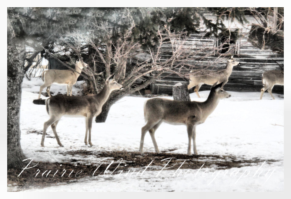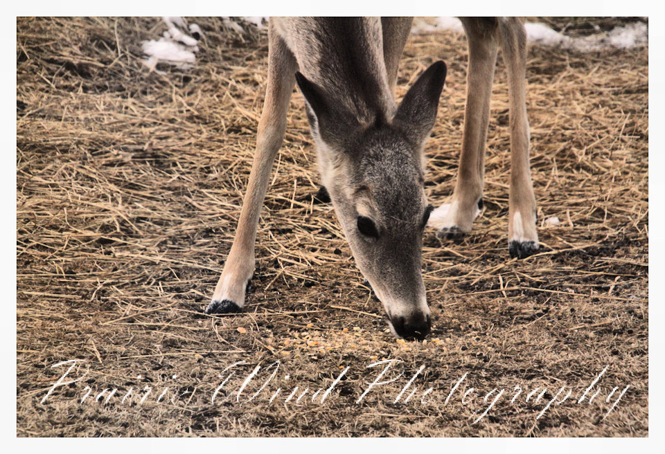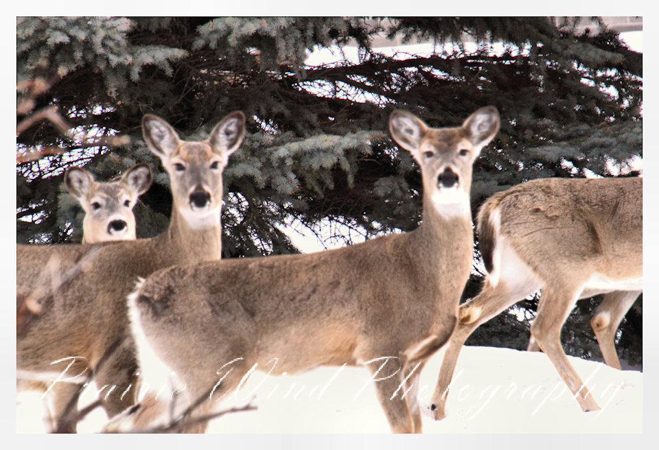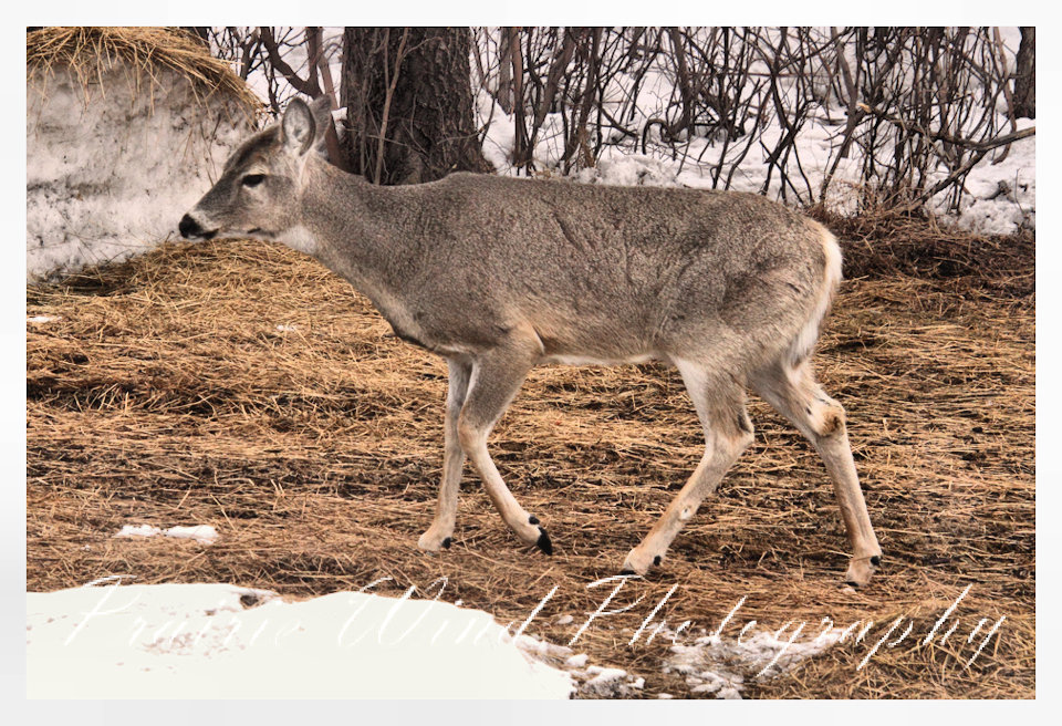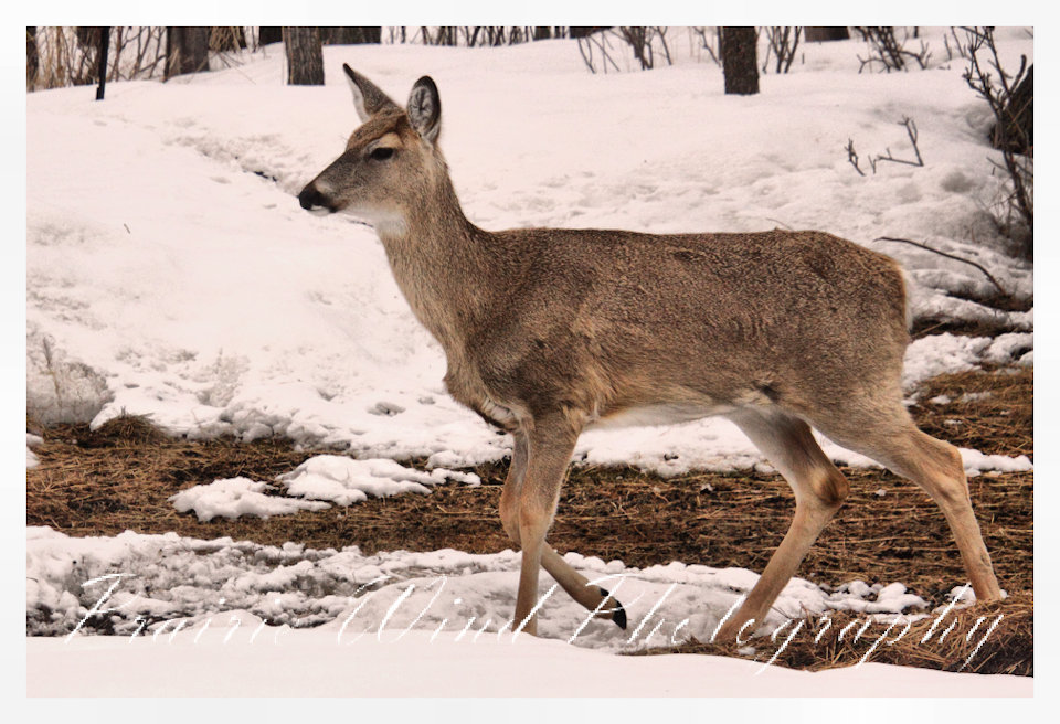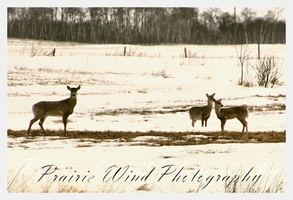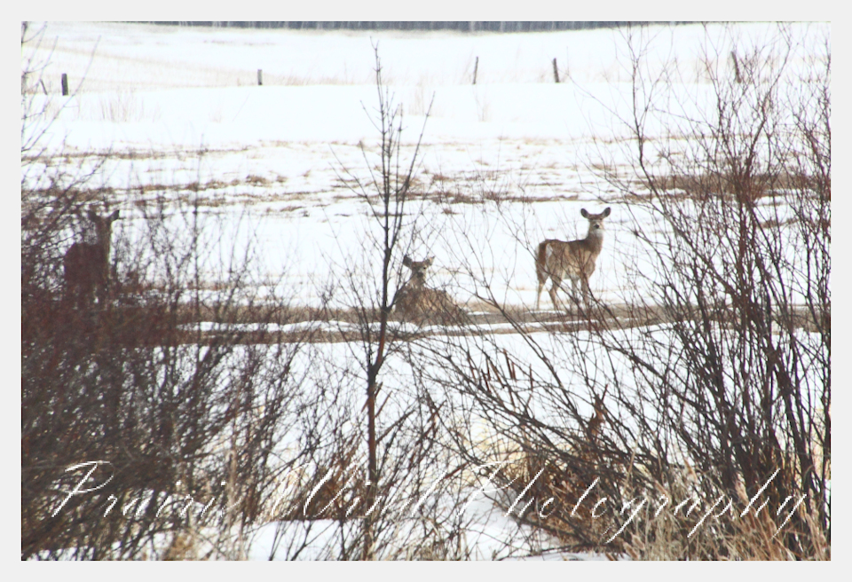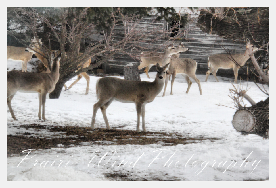 I had the privilege of seeing a herd of about 40 white tail deer. Spring is slowing arriving in my area and the deer are on the move. For awhile it was a pretty decent winter for them, then the snow started to pile up deep and hard. In some areas on hills the wind cleared the snow away and the deer were able to graze. I hope you enjoy these graceful animals.