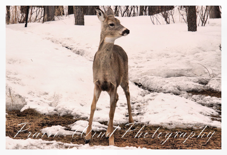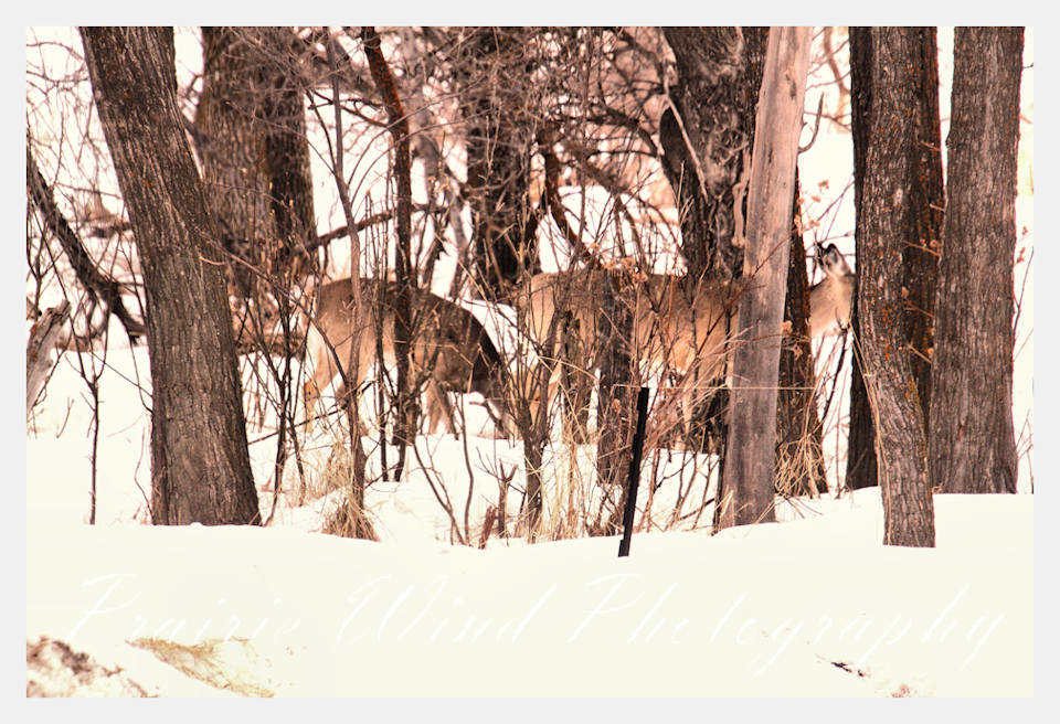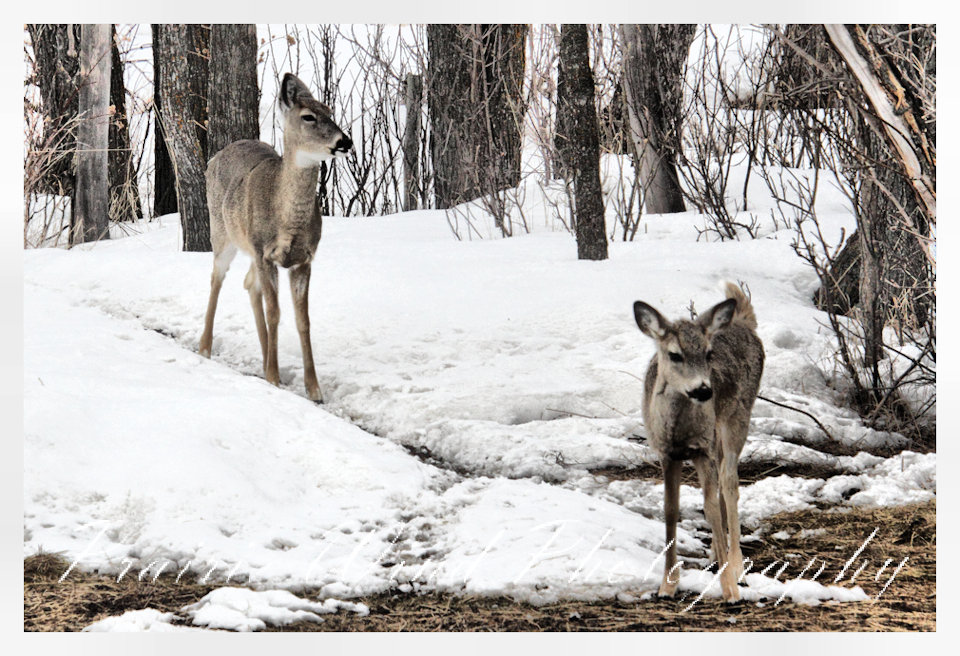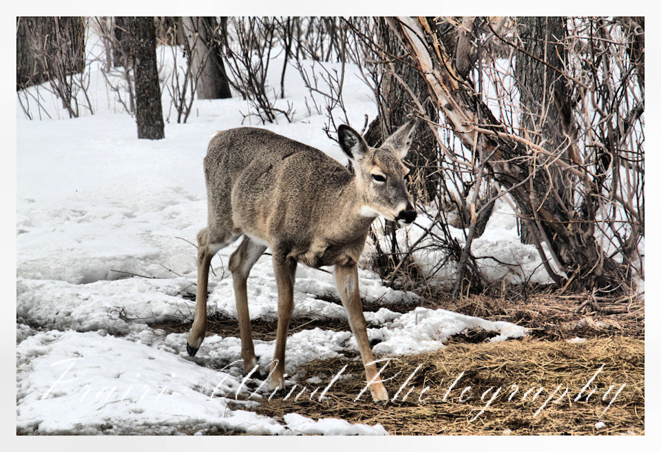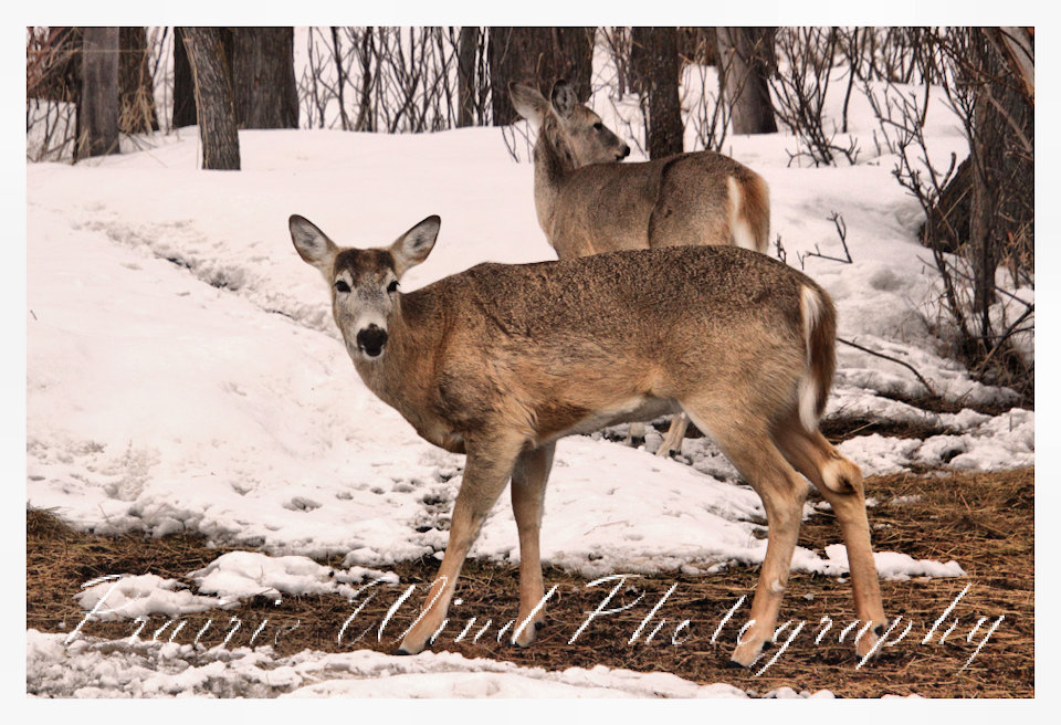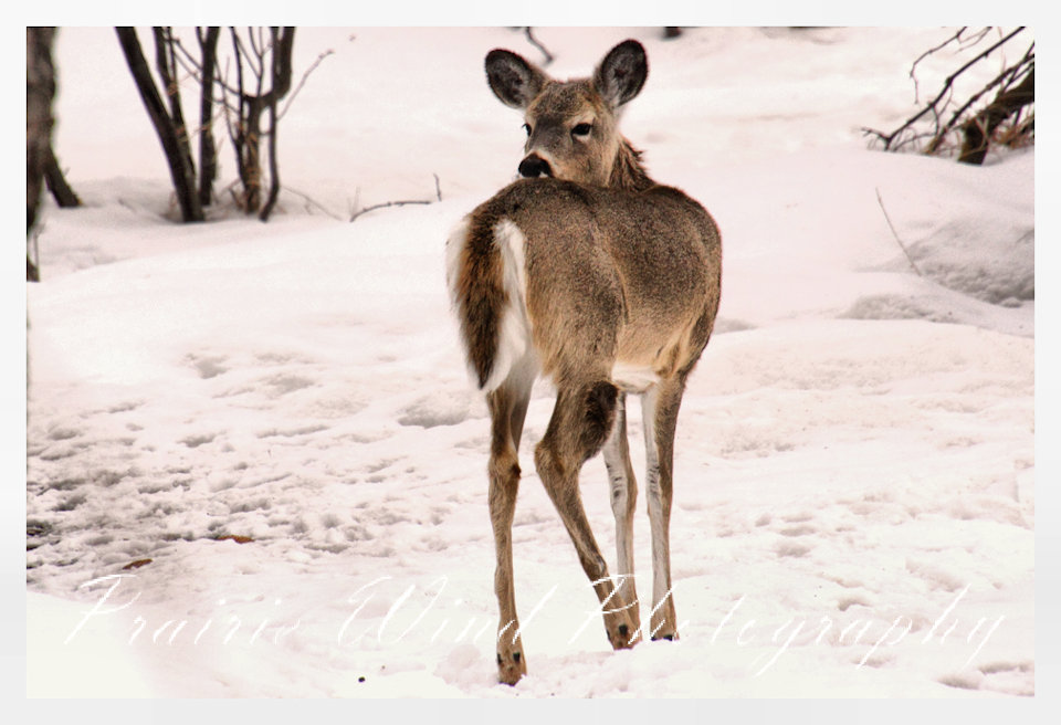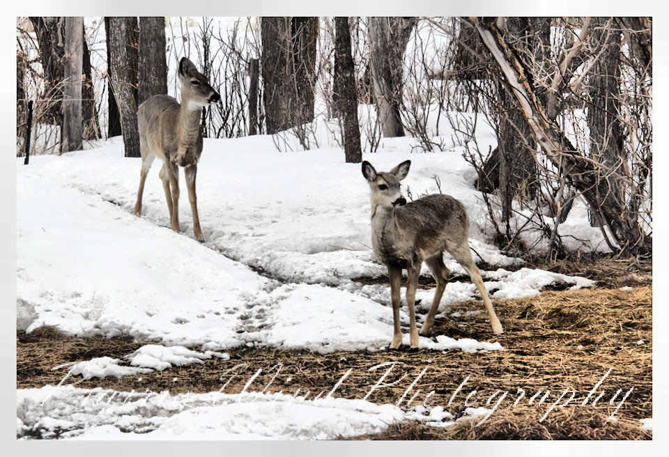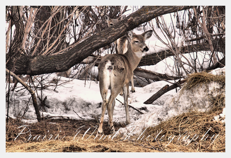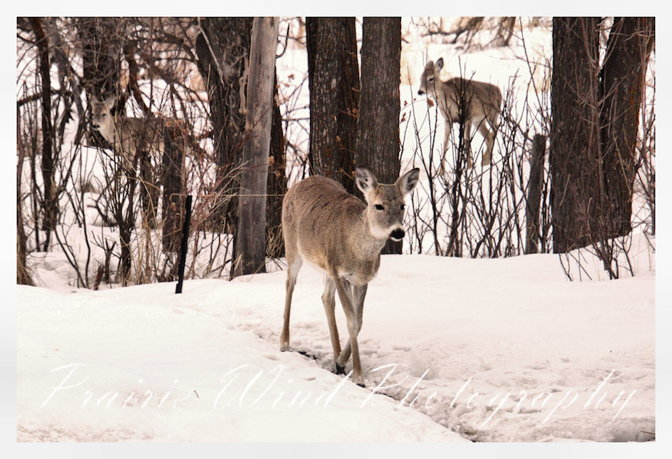I had the privilege of seeing a herd of about 40 white tail deer. Spring is slowing arriving in my area and the deer are on the move. For awhile it was a pretty decent winter for them, then the snow started to pile up deep and hard. In some areas on hills the wind cleared the snow away and the deer were able to graze. I hope you enjoy these graceful animals.