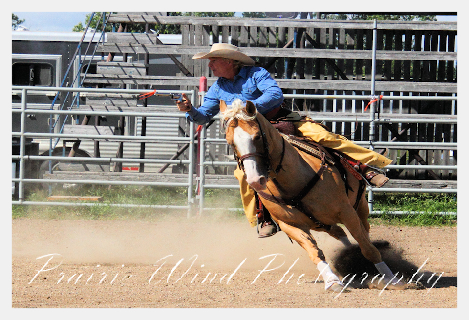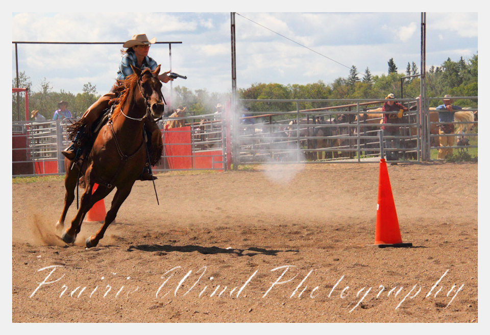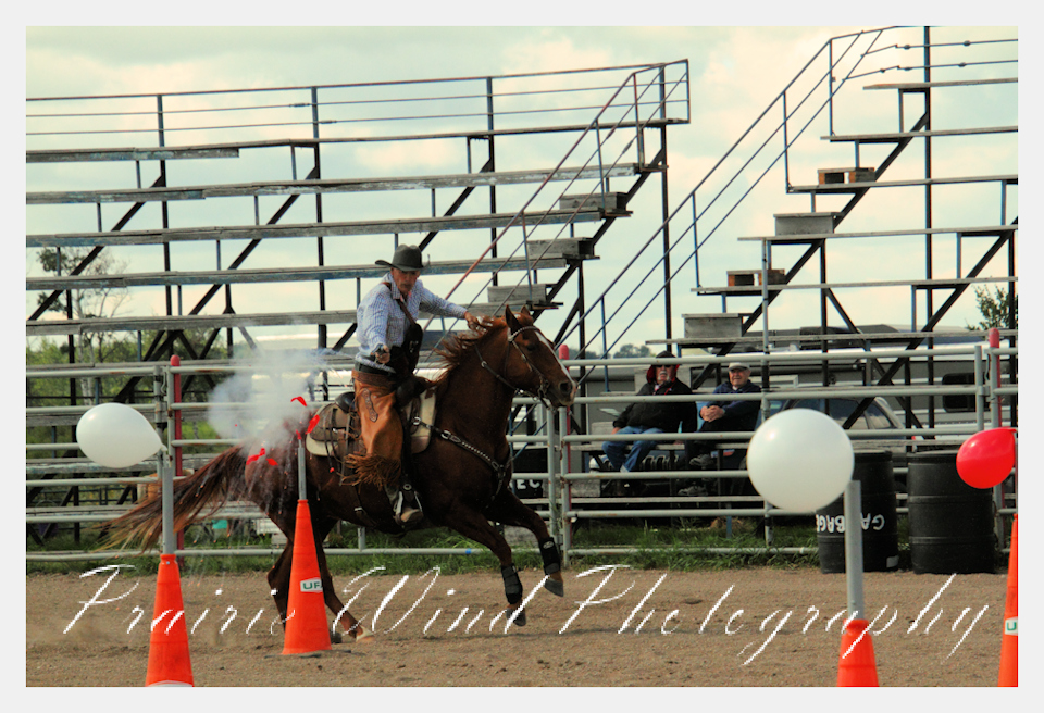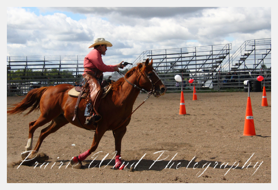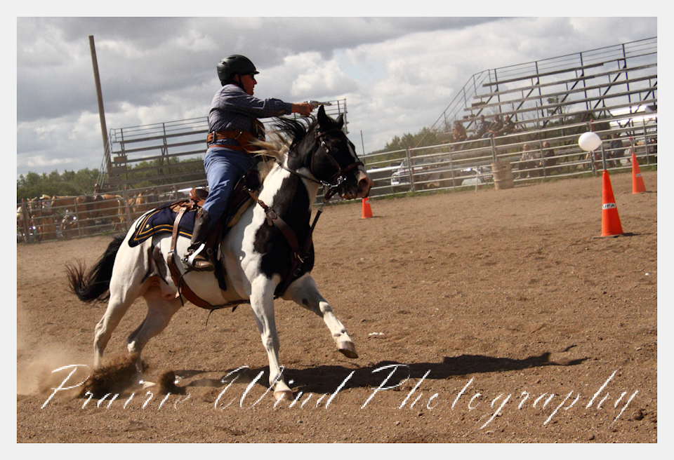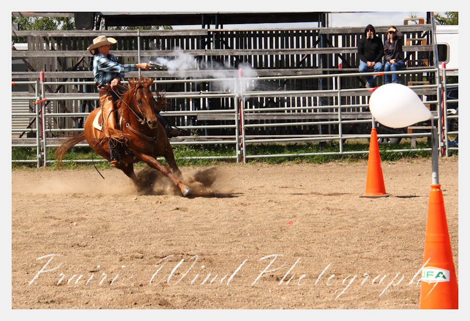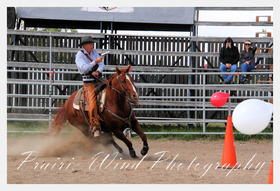 Can you pat your head, rub your tummy and recite a nursery rhyme? How about ride a horse through a designated pattern, and using blank ammunition in different styles of guns and shoot ten ballons. Fastest time wins. I spent a Saturday watching members of the Sask Mounted Shooters show how its done. Mounted shooting requires competitors to use four guns — 2 single-action revolvers, 1 lever-action rifle chambered in pistol caliber, and 1 side-by-side double-barreled shotgun. I was only able to watch the revolver part of the program. It is a pretty fast action sport. Here are some shots from the morning.  Click on the image and then right click to see the complete image and move thru the gallery. Enjoy!