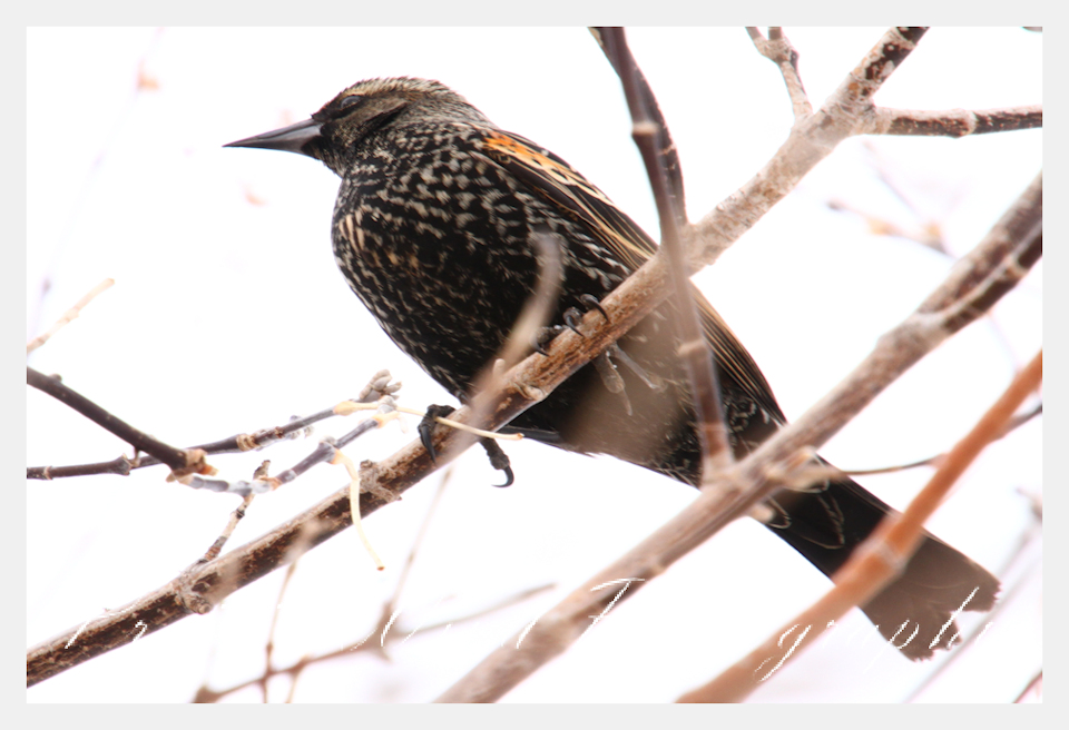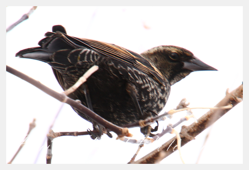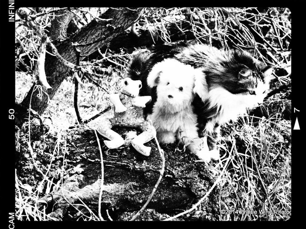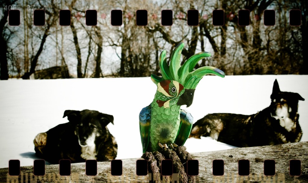 January is flying by. 4th week — 4th posting. Hope you are enjoying them. Up and down week here. Nice weather than we were hit with a blizzard for a few hours one morning. It was over before I got out with the camera. This week is another week of variety. Dogs, Plush friends, still life, more frost and sky shots. Pips makes a friend and Megs gains a protector. Oh and a pretty bird. My bird expert tells me it is a Starling. We have two of them at the feeders. And now this weeks installment. Click on the image and then right click to move thru the gallery.